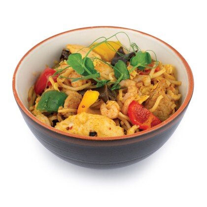Смешанная лапша Хакка с курицей, свининой, креветками и грибами в соусе Шамбала